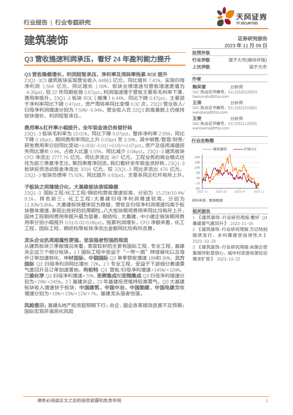 【天风证券】【20231109】建筑装饰行业:Q3营收提速利润承压,看好24年盈利能力提升-25页