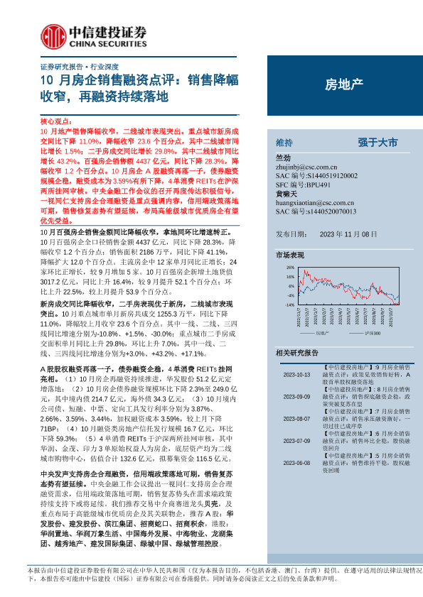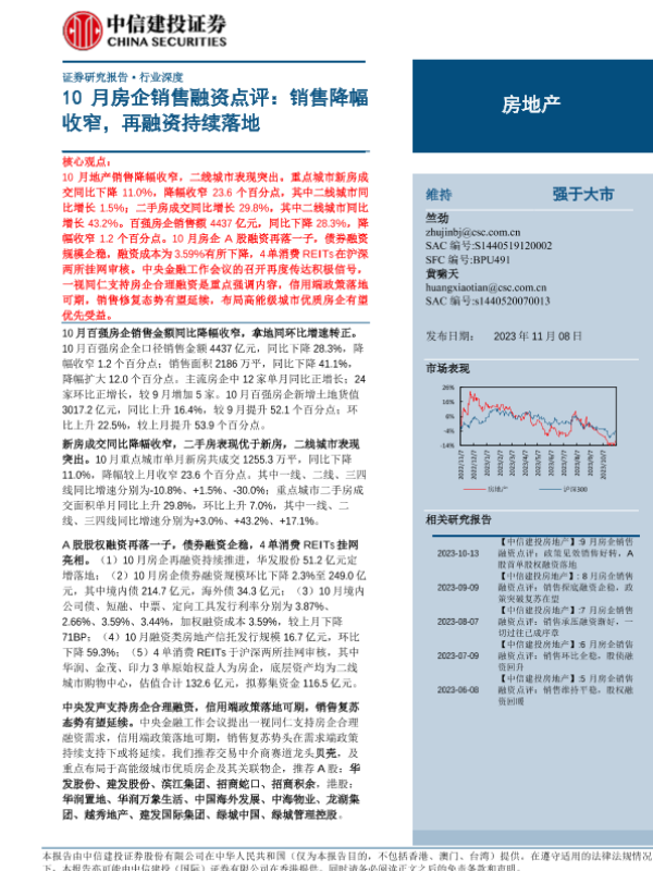 【中信建投证券】【20231108】房地产行业10月房企销售融资点评:销售降幅收窄,再融资持续落地-24页