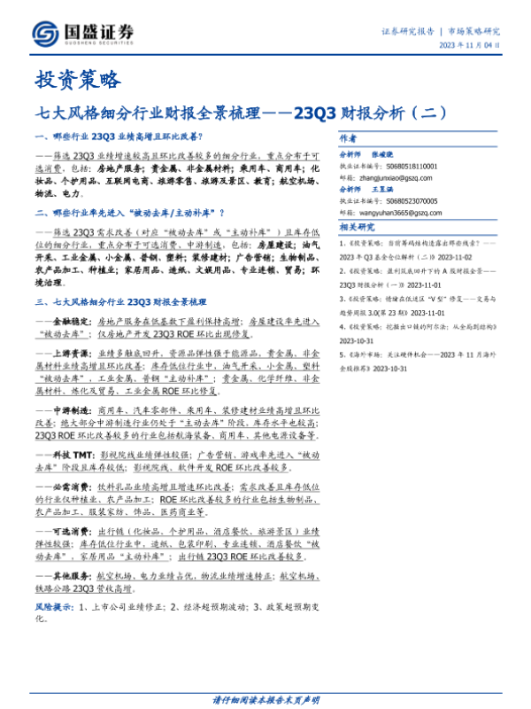 【国盛证券】【20231104】投资策略:23Q3财报分析(二),七大风格细分行业财报全景梳理-24页