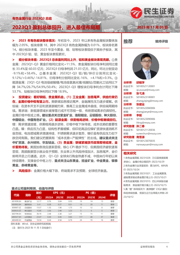 2023Q3 投资建议 行业分析 财务数据 有色金属