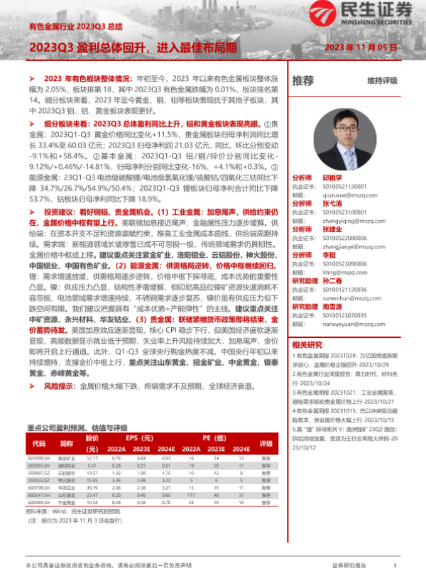 【民生证券】【20231105】有色金属行业2023Q3总结:2023Q3盈利总体回升,进入最佳布局期-52页