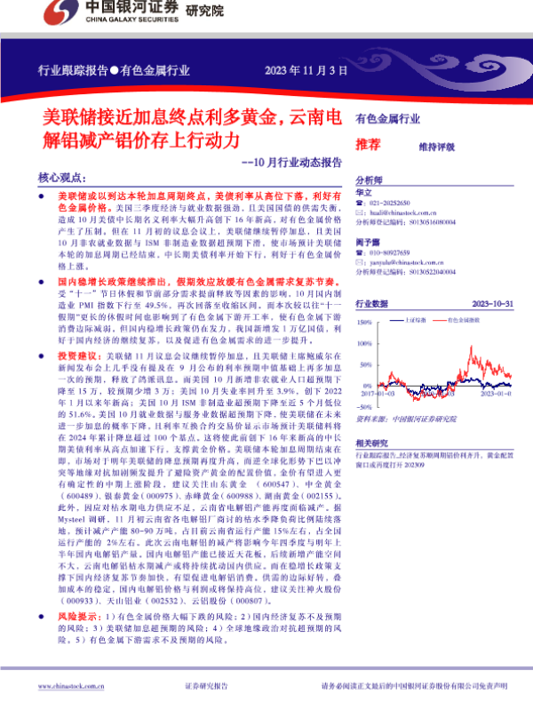 【银河证券】【20231103】有色金属行业10月行业动态报告:美联储接近加息终点利多黄金,云南电解铝减产铝价存上行动力-26页