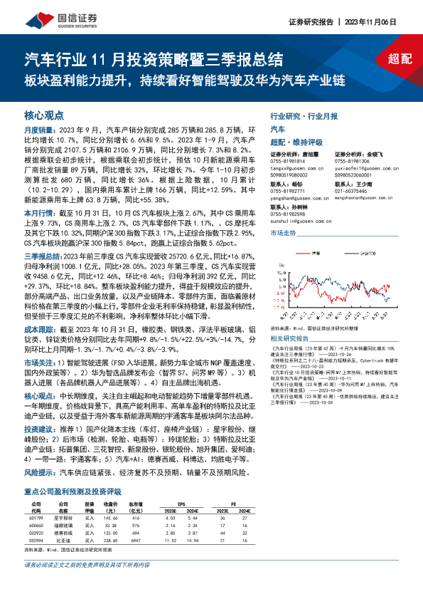 【国信证券】【20231106】汽车行业11月投资策略暨三季报总结:板块盈利能力提升,持续看好智能驾驶及华为汽车产业链-38页