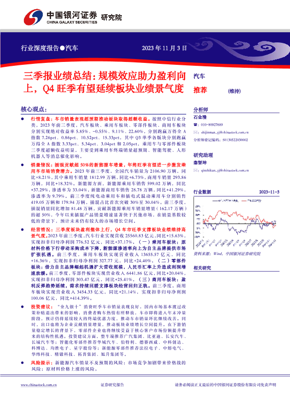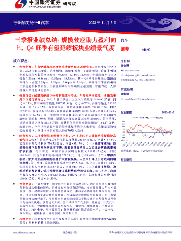 【银河证券】【20231103】汽车行业三季报业绩总结:规模效应助力盈利向上,Q4旺季有望延续板块业绩景气度-26页