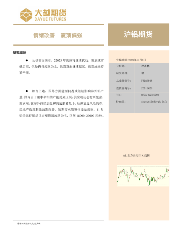 【大越期货】【20231108】沪铝期货月度报告:情绪改善,震荡偏强-20页
