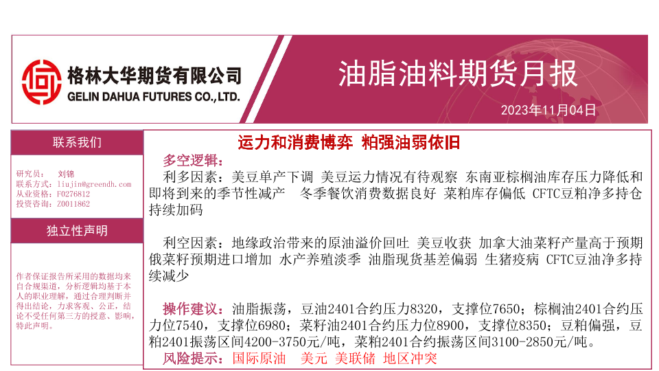【格林大华期货】【20231104】油脂油料期货月报:运力和消费博弈,粕强油弱依旧-34页