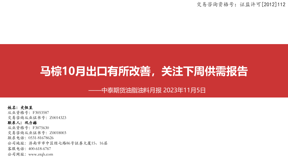 【中泰期货】【20231105】油脂油料月报:马棕10月出口有所改善,关注下周供需报告-52页