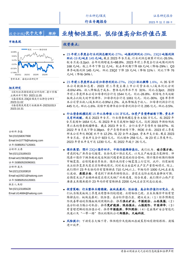【海通证券】【20231109】煤炭行业专题报告:业绩韧性显现,低估值高分红价值凸显-20页