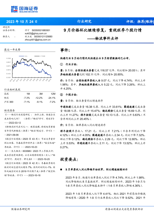 【国海证券】【20231024】物流行业事件点评:9月价格环比继续修复,重视旺季个股行情-15页