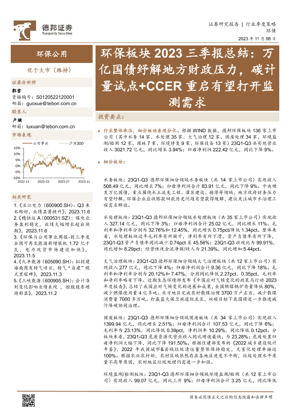 【德邦证券】【20231108】环保行业板块2023三季报总结:万亿国债纾解地方财政压力,碳计量试点+CCER重启有望打开监测需求-31页