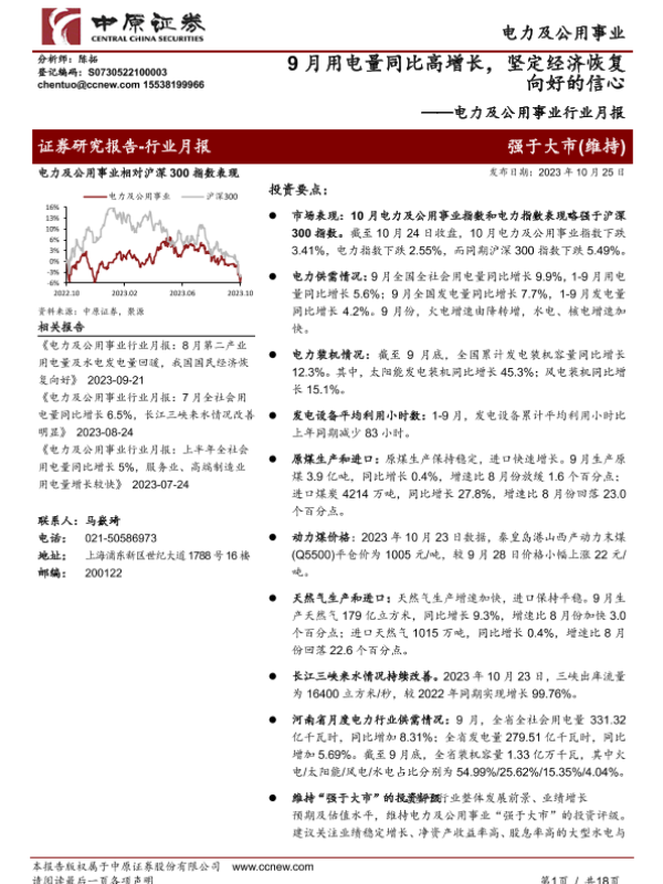 【中原证券】【20231025】电力及公用事业行业月报:9月用电量同比高增长,坚定经济恢复向好的信心-18页