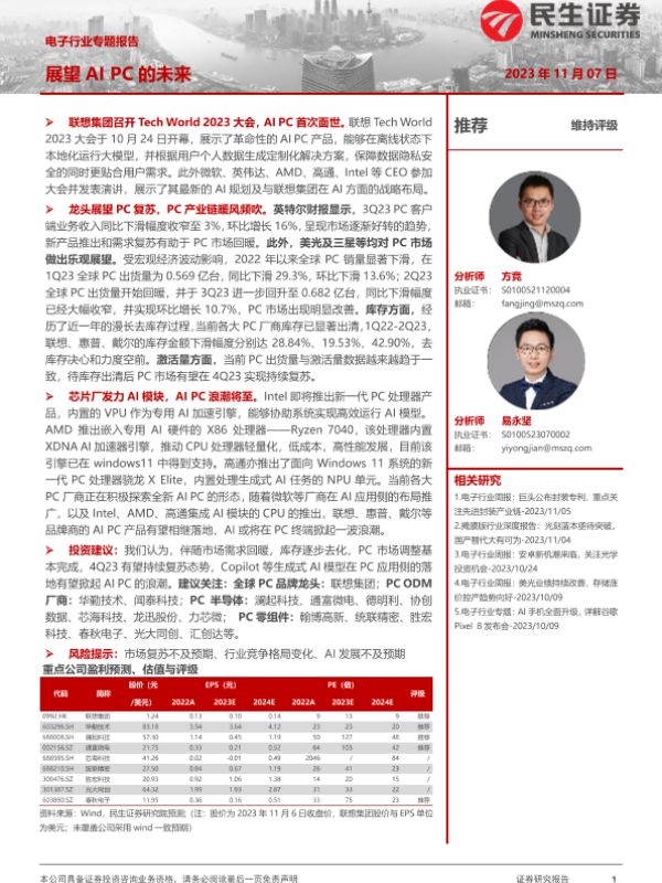 【民生证券】【20231107】电子行业专题报告:展望AI PC的未来-35页