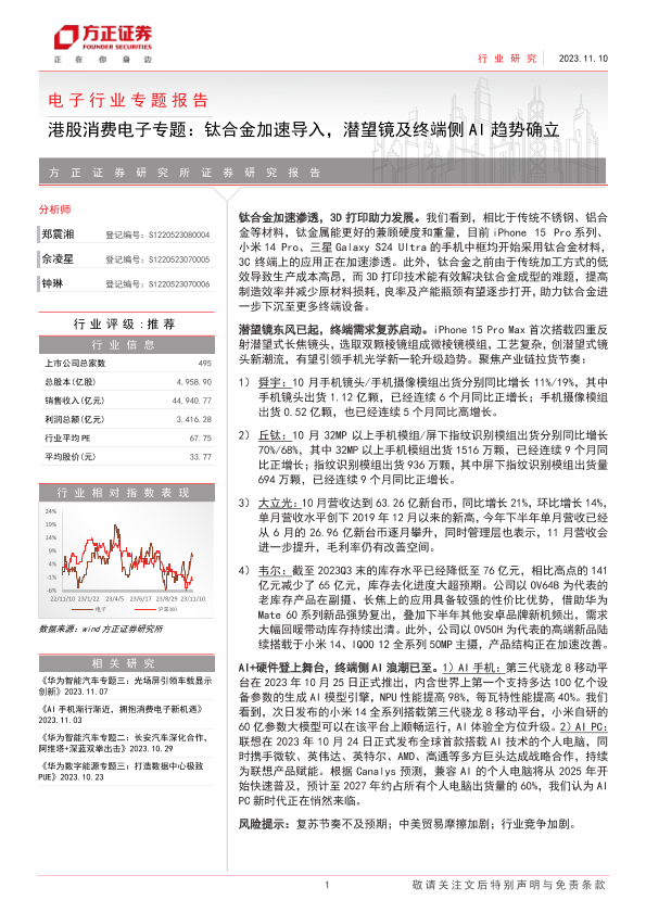 【方正证券】【20231110】电子行业专题报告:港股消费电子专题,钛合金加速导入,潜望镜及终端侧AI趋势确立-31页