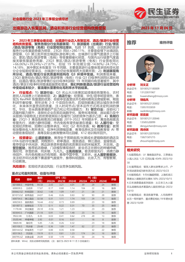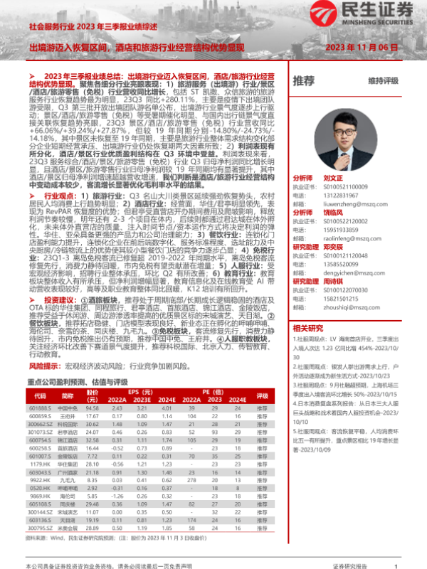 【民生证券】【20231106】社会服务行业2023年三季报业绩综述:出境游迈入恢复区间,酒店和旅游行业经营结构优势显现-38页