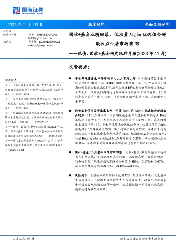 【国海证券】【20231103】纯债、固收+基金研究跟踪月报(2023年11月):固收+基金业绩回落,低动量Alpha优选组合超额收益位居市场前3%-22页