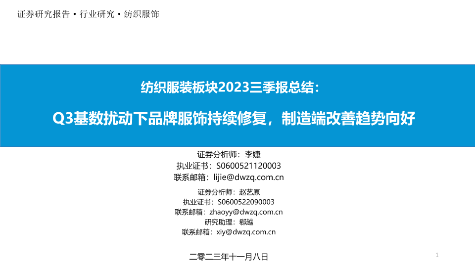 【东吴证券】【20231108】纺织服装行业板块2023三季报总结:Q3基数扰动下品牌服饰持续修复,制造端改善趋势向好-38页