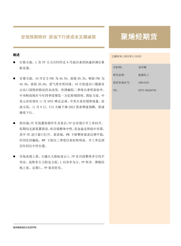【大越期货】【20231109】聚烯烃期货月度报告:宏观预期转好,原油下行使成本支撑减弱-20页