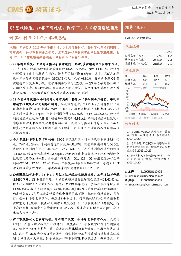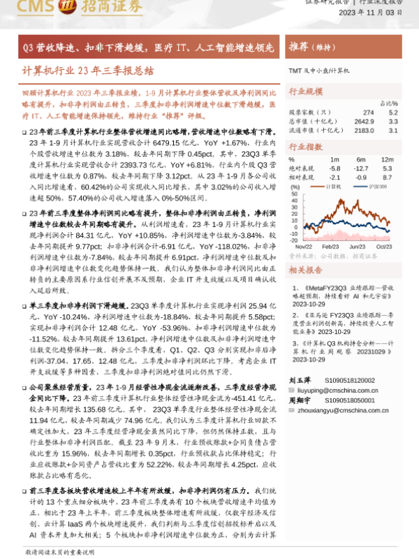【海通证券】【20231103】计算机行业23年三季报总结:Q3营收降速、扣非下滑趋缓,医疗IT、人工智能增速领先-43页