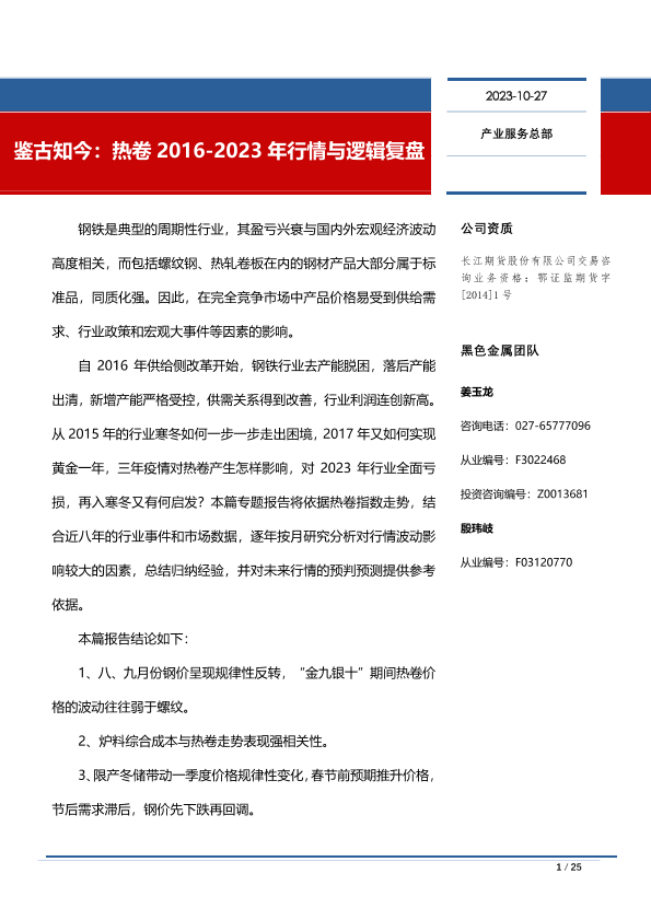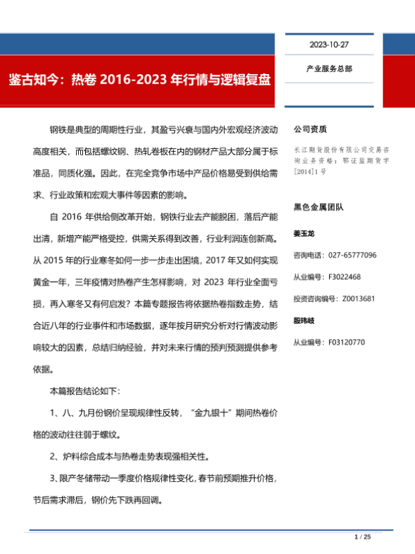 【长江期货】【20231027】鉴古知今:热卷2016_2023年行情与逻辑复盘-25页