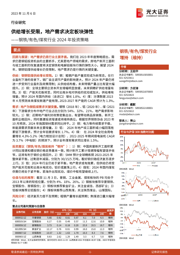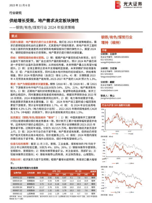 【光大证券】【20231106】钢铁有色煤炭行业2024年投资策略:供给增长受限,地产需求决定板块弹性-43页