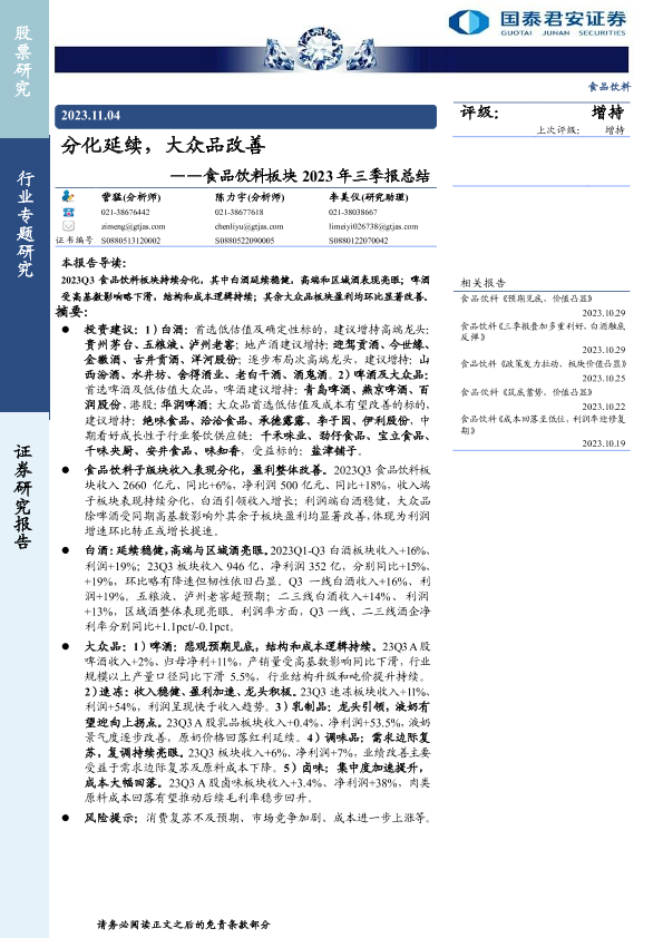 【国泰君安证券】【20231104】食品饮料行业板块2023年三季报总结:分化延续,大众品改善-42页