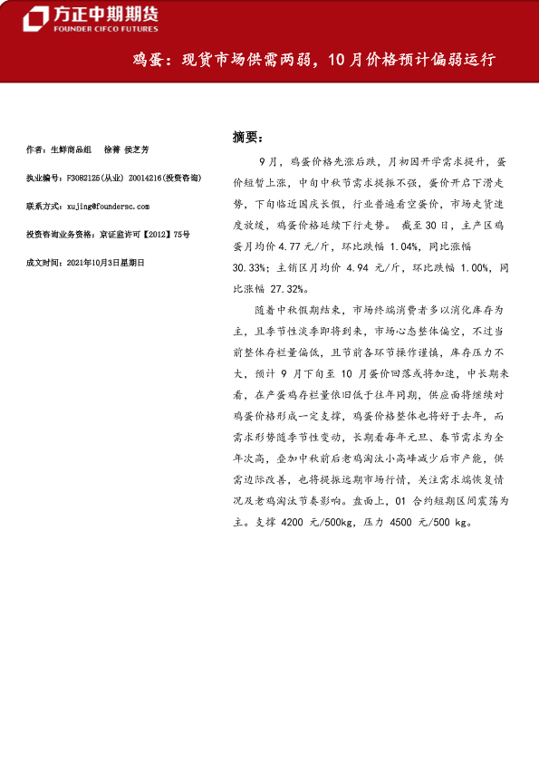 【方正中期期货】【20211003】鸡蛋:现货市场供需两弱,10月价格预计偏弱运行-17页