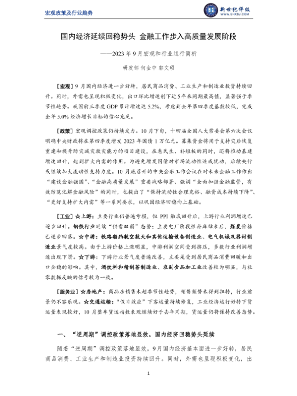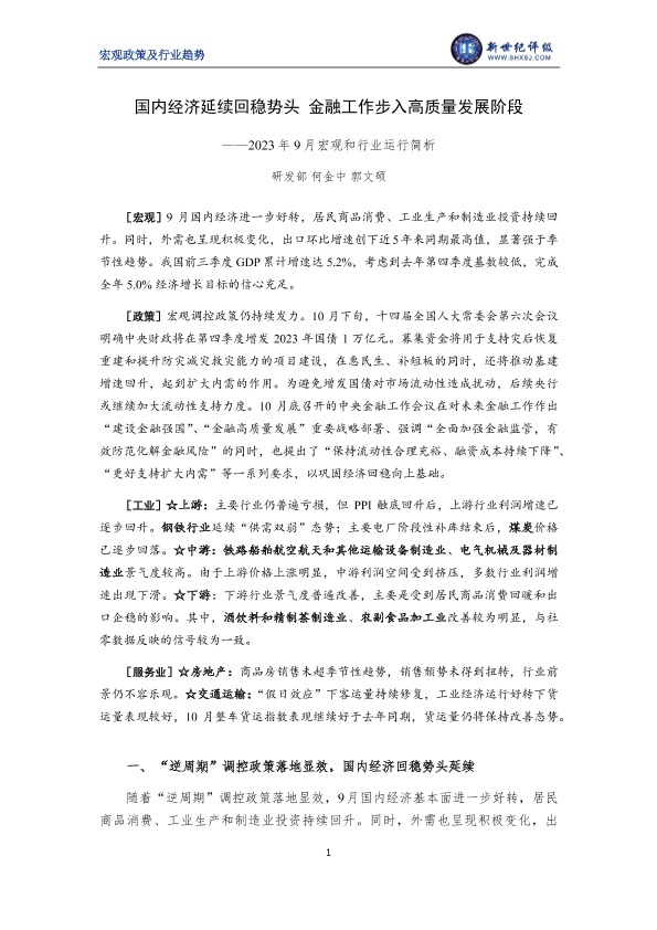 【新世纪评级】【20230901】国内经济延续回稳势头 金融工作步入高质量发展阶段——2023年9月宏观和行业运行简析-13页