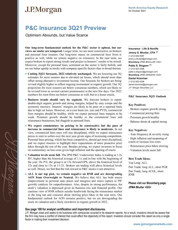 【J.P. Morgan】【20211004】P&C Insurance 3Q21 Preview Optimism Abounds, but Value Scarce-112页