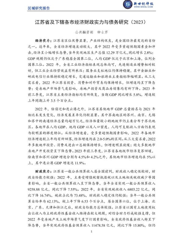 债务研究 城市经济 江苏省 经济分析 财政实力