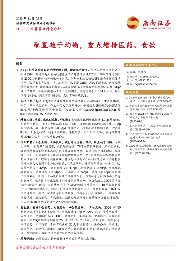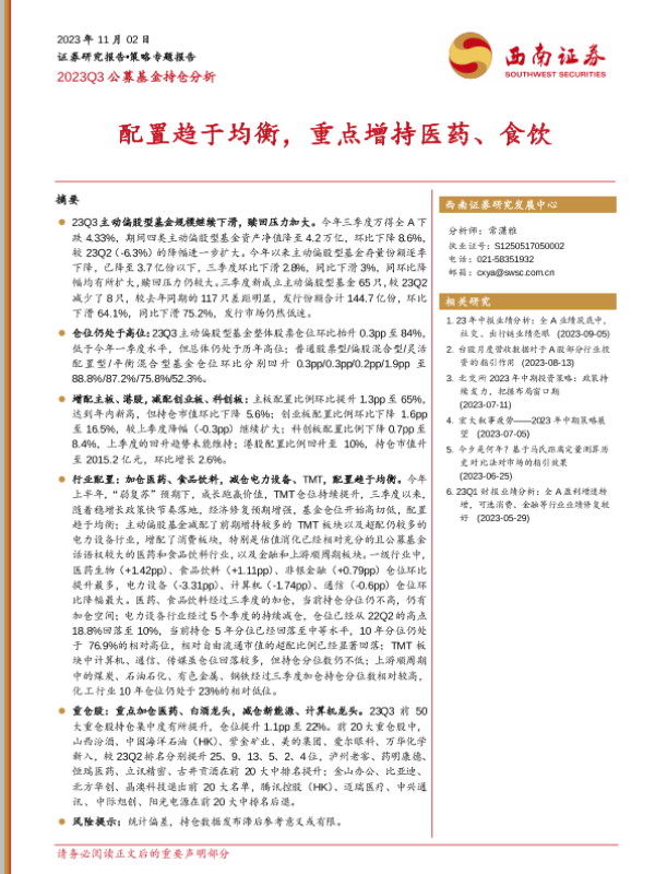【西南证券】【20231102】2023Q3公募基金持仓分析:配置趋于均衡,重点增持医药、食饮-19页