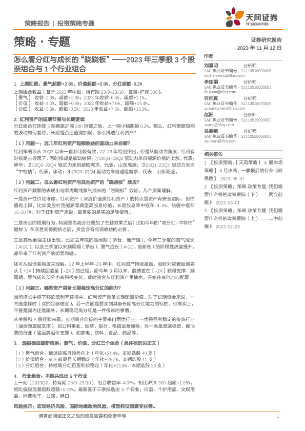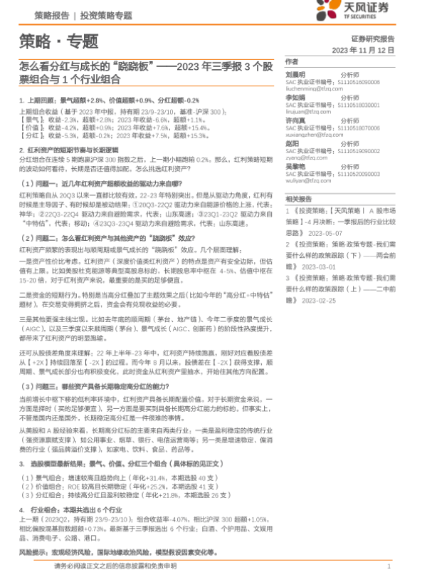 【天风证券】【20231112】2023年三季报3个股票组合与1个行业组合:怎么看分红与成长的“跷跷板”-23页