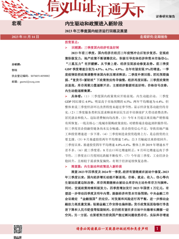 【山西证券】【20231114】2023年三季度国内经济运行回顾及展望:内生驱动和政策进入新阶段-34页