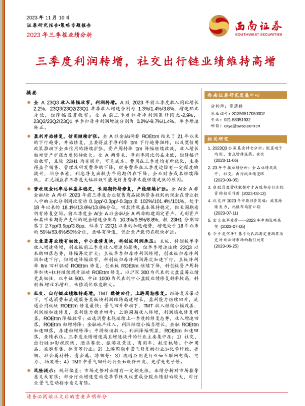 【西南证券】【20231110】2023年三季报业绩分析:三季度利润转增,社交出行链业绩维持高增-21页