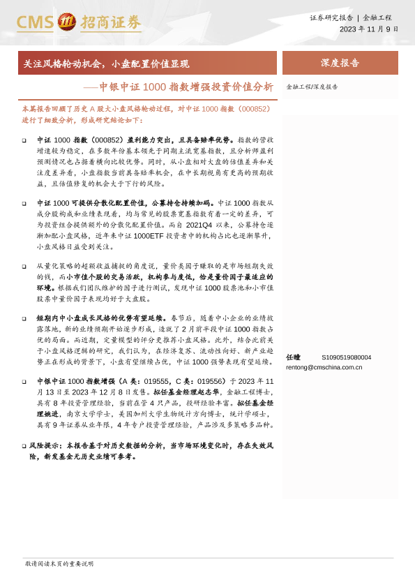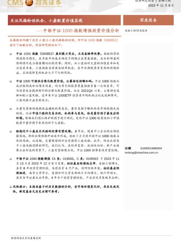 【海通证券】【20231109】中银中证1000指数增强投资价值分析:关注风格轮动机会,小盘配置价值显现-16页