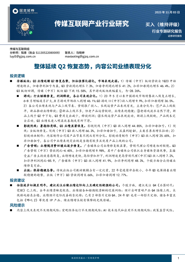 【国金证券】【20231103】传媒互联网产业行业专题研究报告:整体延续Q2恢复态势,内容公司业绩表现分化-18页