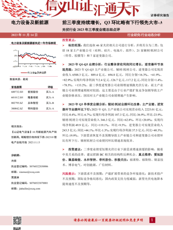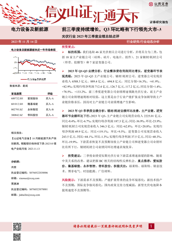 【山西证券】【20231114】光伏行业2023年三季度业绩总结点评:前三季度持续增长,Q3环比略有下行-20页