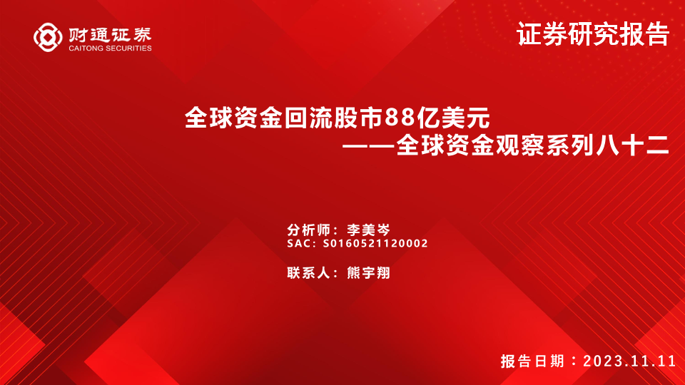 【财通证券】【20231111】全球资金观察系列八十二:全球资金回流股市88亿美元-30页