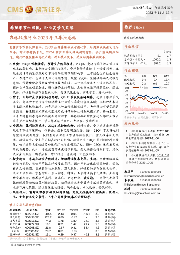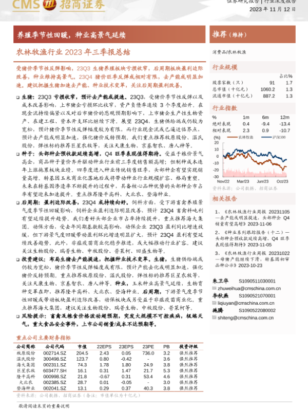 【海通证券】【20231112】农林牧渔行业2023年三季报总结:养殖季节性回暖,种业高景气延续-22页
