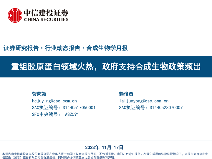 【中信建投证券】【20231117】医药行业合成生物学月报:重组胶原蛋白领域火热,政府支持合成生物政策频出-53页