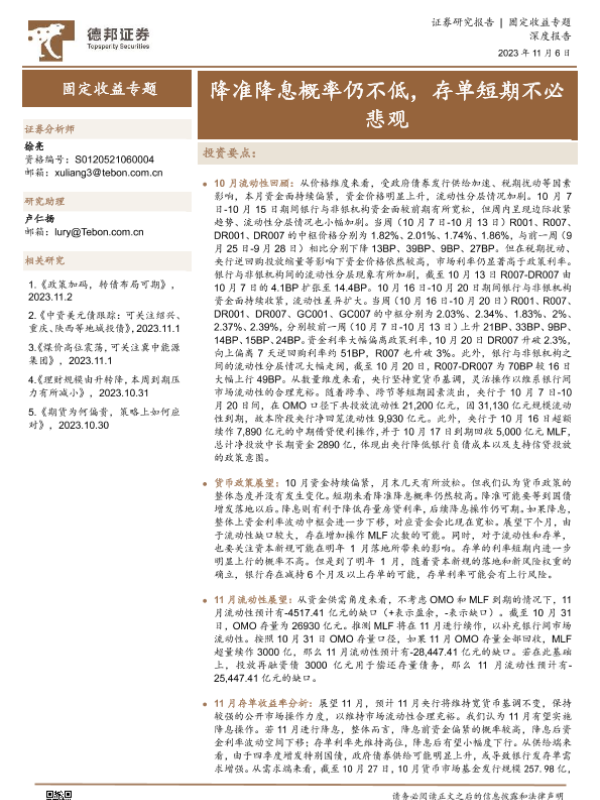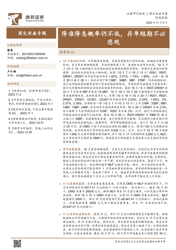【德邦证券】【20231106】固定收益专题:降准降息概率仍不低,存单短期不必悲观-19页