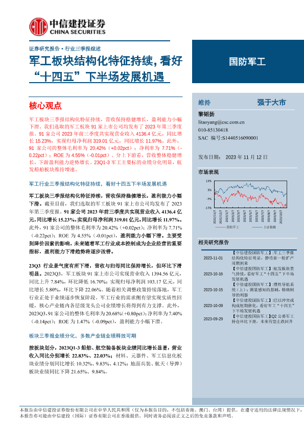 【中信建投证券】【20231112】国防军工行业三季报综述:军工板块结构化特征持续,看好“十四五”下半场发展机遇-32页