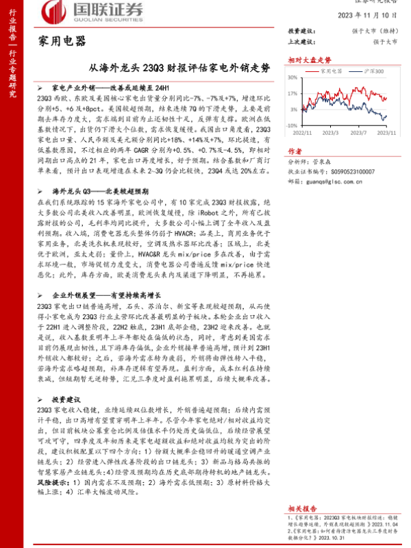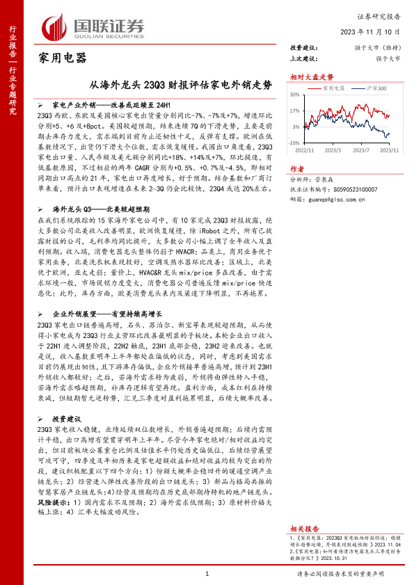 【国联证券】【20231110】家用电器行业专题研究:从海外龙头23Q3财报评估家电外销走势-31页