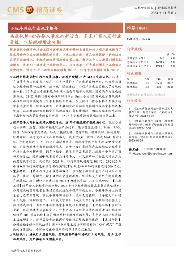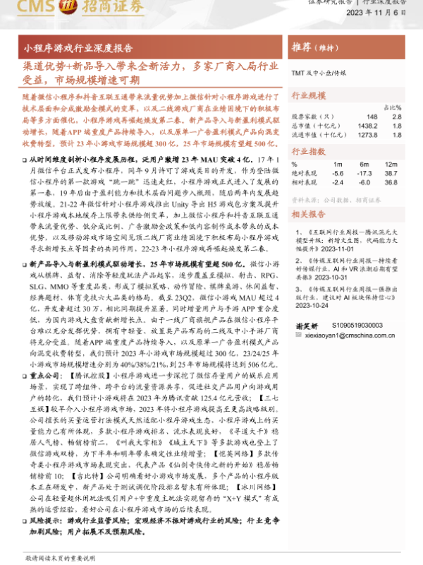 【海通证券】【20231106】小程序游戏行业深度报告:渠道优势+新品导入带来全新活力,多家厂商入局行业受益,市场规模增速可期-17页