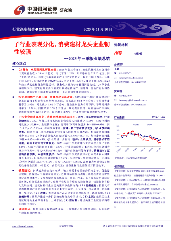 【银河证券】【20231110】建筑材料行业2023年三季报业绩总结:子行业表现分化,消费建材龙头企业韧性较强-24页