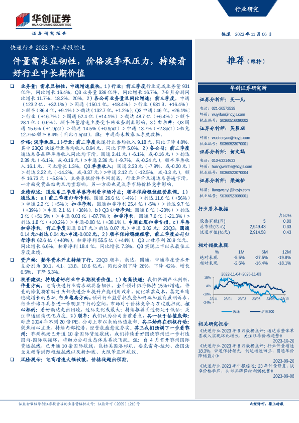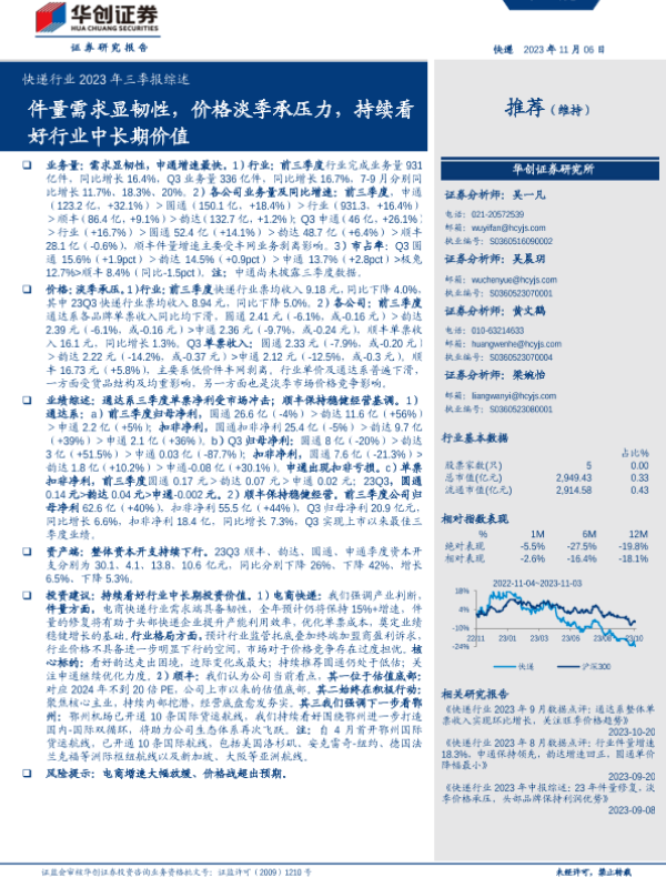 【华创证券】【20231106】快递行业2023年三季报综述:件量需求显韧性,价格淡季承压力,持续看好行业中长期价值-18页