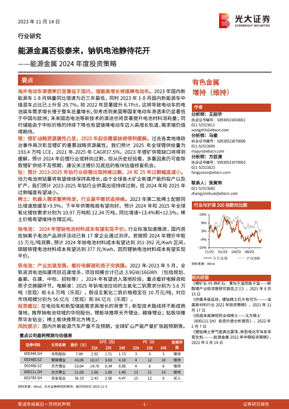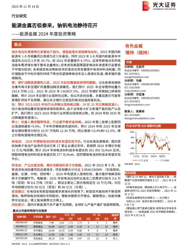 【光大证券】【20231114】有色金属行业能源金属2024年度投资策略:能源金属否极泰来,钠钒电池静待花开-40页