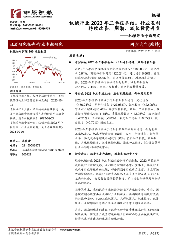 【中原证券】【20231110】机械行业2023年三季报总结:行业盈利持续改善,周期、成长投资并重-21页