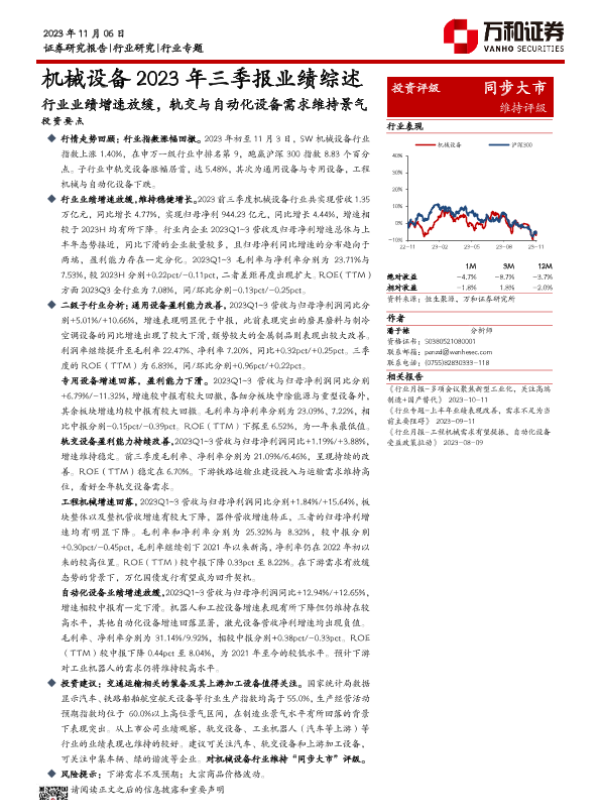 【万和证券】【20231106】机械设备行业2023年三季报业绩综述:行业业绩增速放缓,轨交与自动化设备需求维持景气-17页