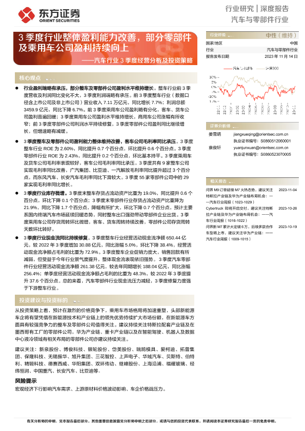 【东方证券】【20231114】汽车行业3季度经营分析及投资策略:3季度行业整体盈利能力改善,部分零部件及乘用车公司盈利持续向上-23页