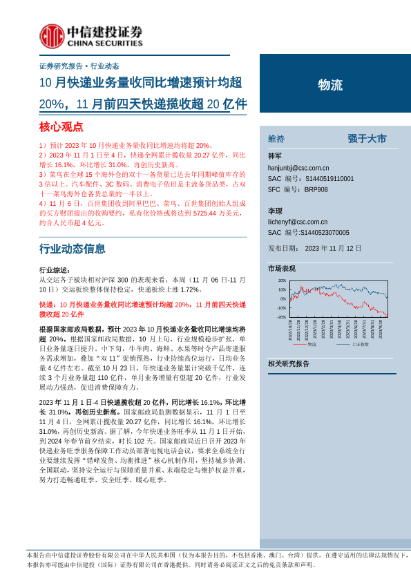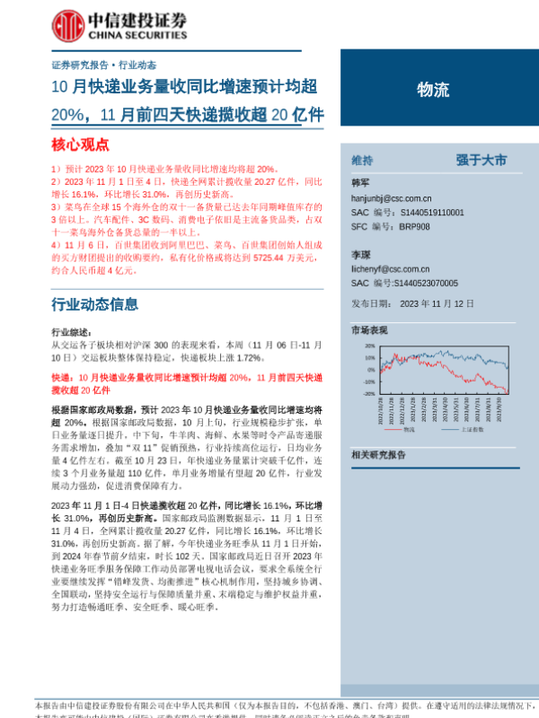【中信建投证券】【20231112】物流行业:10月快递业务量收同比增速预计均超20%,11月前四天快递揽收超20亿件-24页